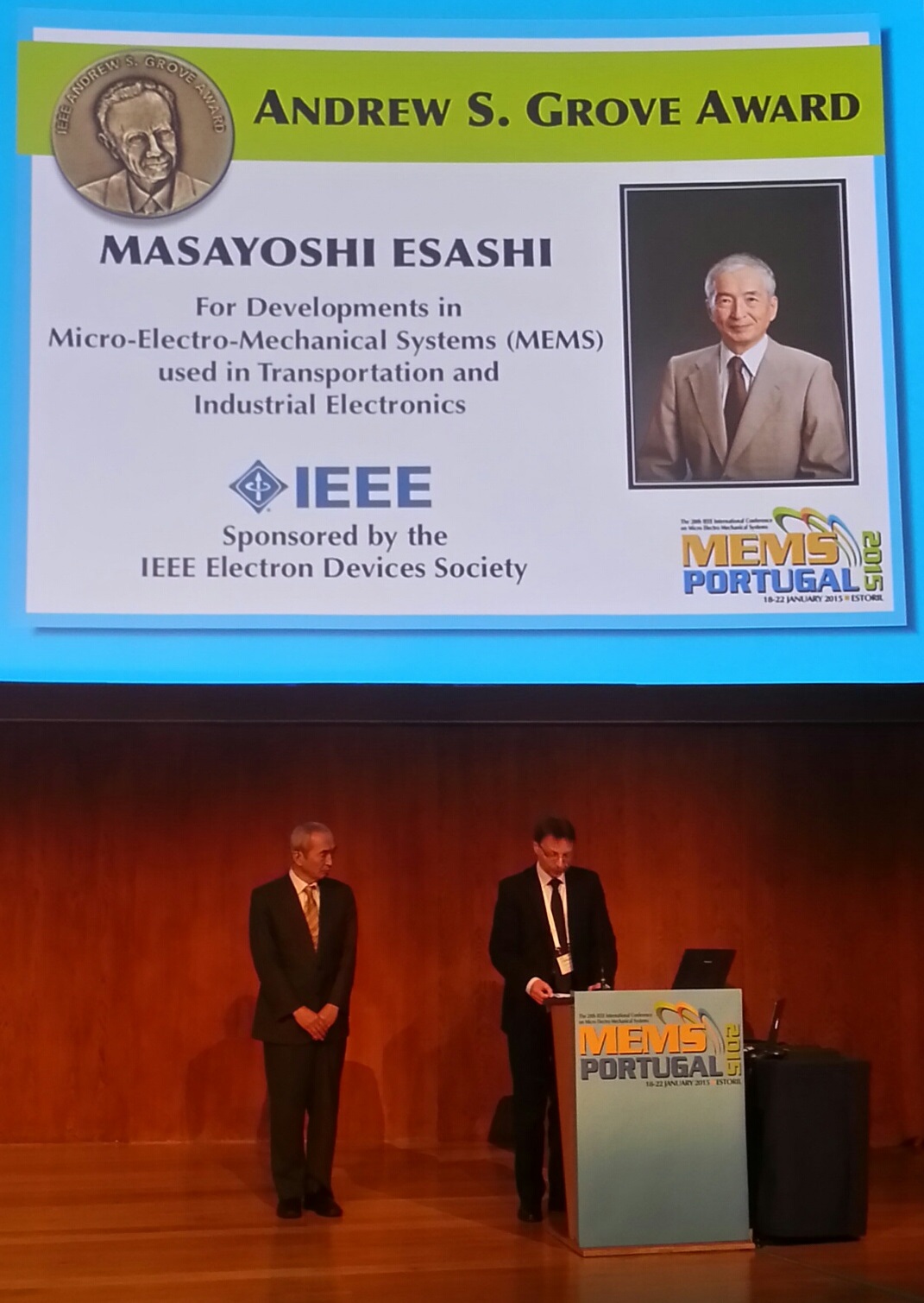 江刺正喜先生が2015年の IEEE Andrew S. Grove Awardを受賞され,IEEE MEMS 2015国際会議(2015年1月18-22日,エストリル,ポルトガル)でメダルを受け取られました。Andrew S. Grove博士はIntelの創業時メンバーの1人で,同社の社長,CEO,および会長を歴任していますが,それにちなんだこの賞は固体素子分野において,実用的価値創出を含む顕著な貢献がある研究者に贈られます。今回の江刺先生の御受賞に対し,教えを乞うた者として大変嬉しく思います。真・ノおめでとうございます。